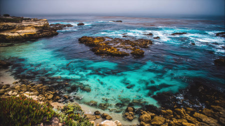 a breathtaking scenery featuring rocks and various animals, captured in the ethereal style of seascapes reminiscent of the san francisco renaissance. this documentary-style photograph showcases a soft atmospheric perspective from a birds-eye-view perspective. shot with the sony fe 85mm f/1.4 gm lens, this image beautifully embodies the artistic vision of brent heighton. ai generated