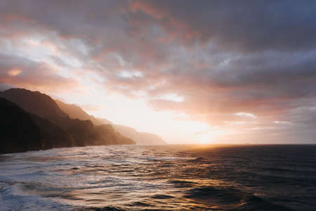 Aerial view of the Pacific Ocean at sunset. Drone photography.