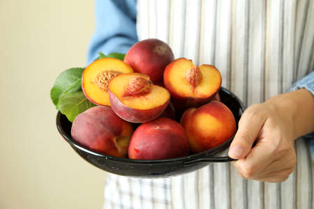 Girl in apron holds bowl with ripe peach fruits