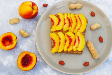 Traditional American and European summer breakfast: sandwiches of toast with peanut butter, berry,peach,fig, strawberry,raspberry, copy space top view