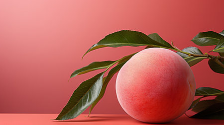 Fresh juicy peach with green leaves isolated on a pink background.