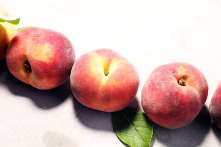 Fresh ripe chinese flat saturn organic peaches with leaves