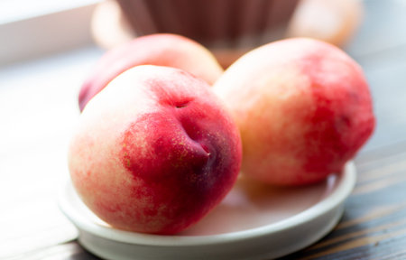 ripe juicy chinese flat peaches or Saturn peaches