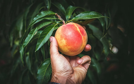 A close-up of a person's hand gently grasping a sun-kissed peach on a leafy branch, with warm sunlight creating a vibrant and fresh orchard atmosphere