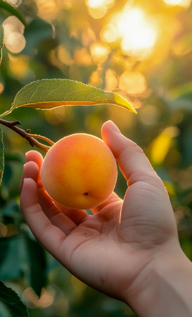 A hand gently cradles a freshly picked apricot, illuminated by soft, natural light in a tranquil environment.