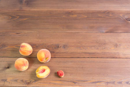 Ripe tasty peaches on a wooden brown surface in vintage style.