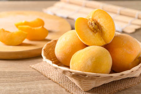 Yellow peaches in a bamboo basket on wooden table