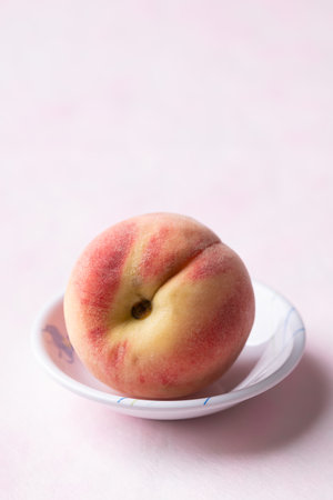Fresh peach in a bowl on pink background, Summer fruit