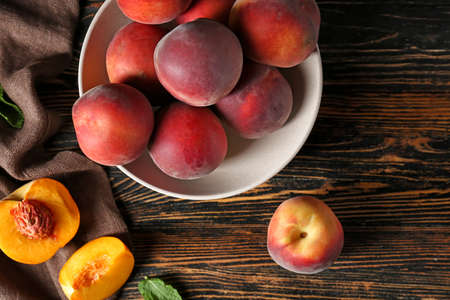 Bowl with tasty peaches on wooden table