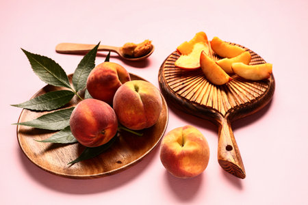 Plate of sweet peaches and wooden board with pieces on pink background