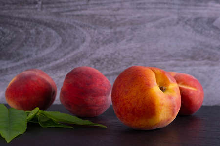 Several ripe juicy peaches on a gray background. Peach fruits on the wooden board. Green living concept. Organic food.