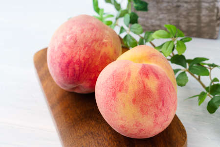 Fresh peaches on a white wooden background. Selective focus.