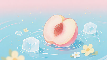 Illustration of peach with ice cubes and flowers on a blue background