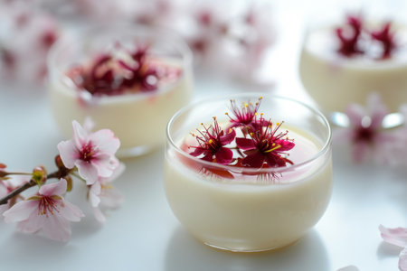 Panna cotta topped with a delicate cherry blossoms in syrup. Generative AI illustration