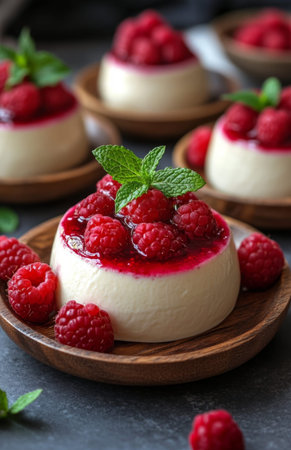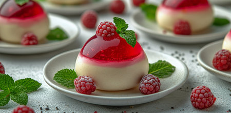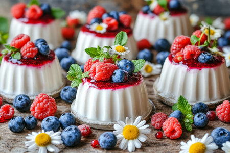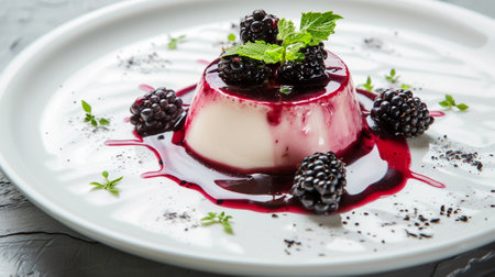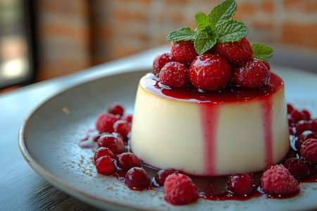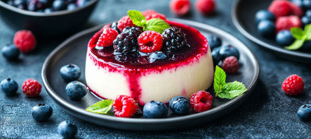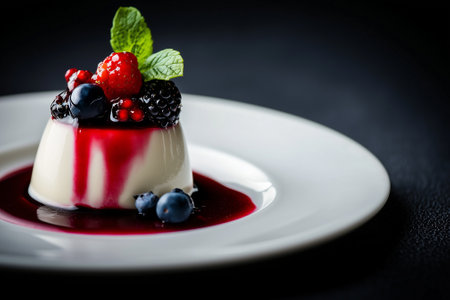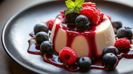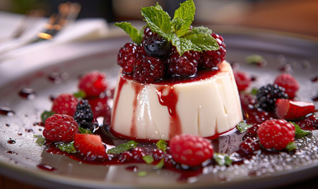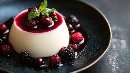 A delightful dessert featuring creamy panna cotta topped with fresh berries and a sprig of mint. Perfect for gourmet presentations and sweet indulgence.