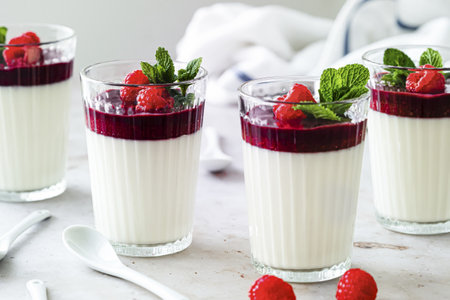 Delicious and Creamy Vanilla Panna Cotta Dessert with Berry Coulis and Fresh Summer Fruits on Table