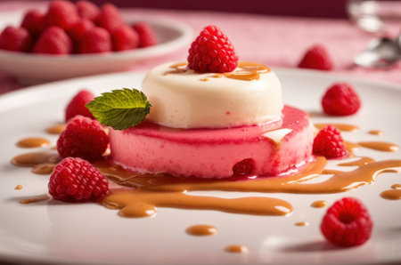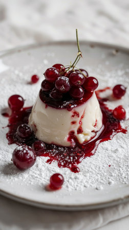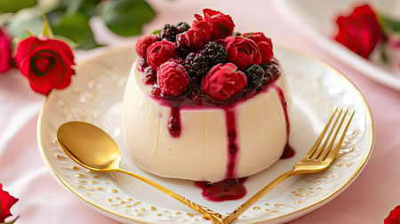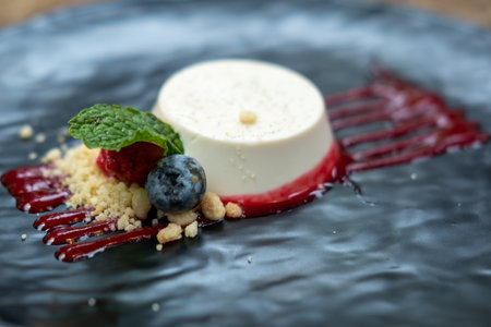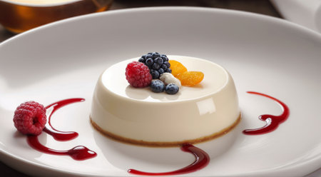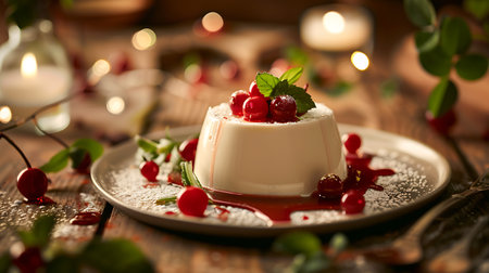 Beautifully plated panna cotta topped with a fresh berry compote. Tasty dessert on the plate close up. Generative AI
