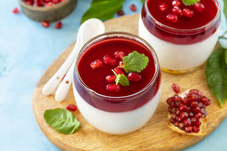 Italian dessert panna cotta with pomegranate. Vegetarian food. Healthy eating. Recipe