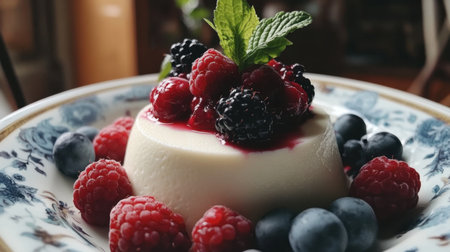 A close-up of a delicate, gourmet Italian dessert of panna cotta topped with fresh berries and a mint garnish, placed on a fine china plate.
