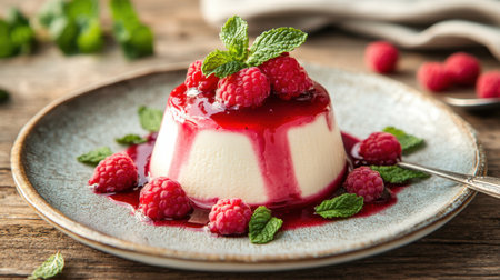 A beautiful plate of Italian panna cotta, topped with fresh raspberry sauce and mint leaves, served on a rustic wooden table.