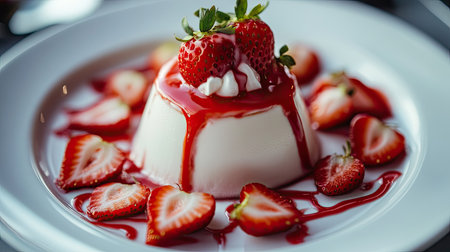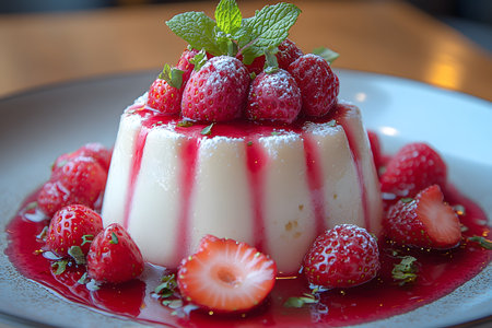 Creamy panna cotta topped with a vibrant raspberry sauce and garnished with fresh strawberries and mint leaves, presented on a rustic plate. ideal for culinary presentations, dessert menus, and food blogs. Generative AI