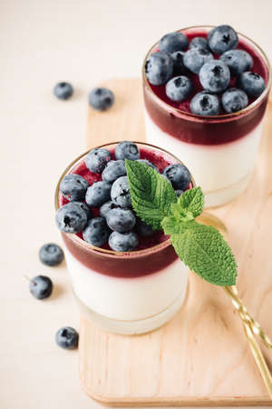 Two glasses of gelatin dessert with blueberries. Yogurt and blueberry jelly.