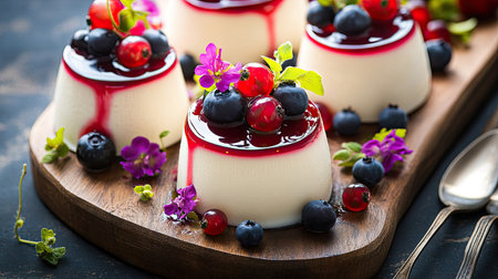 Panna cotta served with a glossy red currant sauce, fresh fruit toppings, and floral decorations, styled on a rustic wooden board