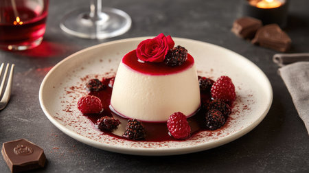 A silky and smooth rose panna cotta, drizzled with berry compote, surrounded by delicate flowers and soft candlelight for Valentine's Day.
