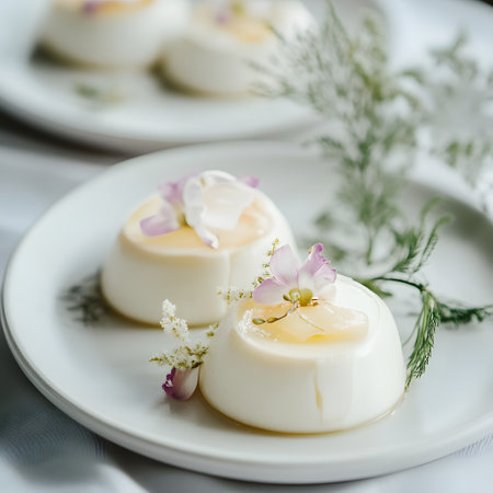 Smooth Textures and Glossy Finish. Floral Cakes. Creamy panna cotta with spring flowers on a white plate