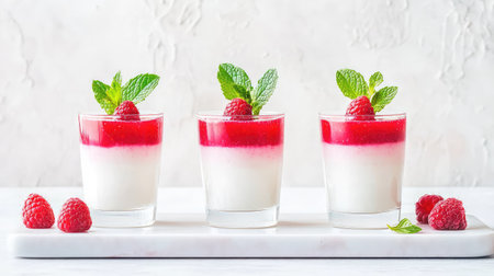 Delight in a visually stunning dessert featuring layered raspberry panna cotta served in elegant glass cups, garnished with fresh mint leaves.