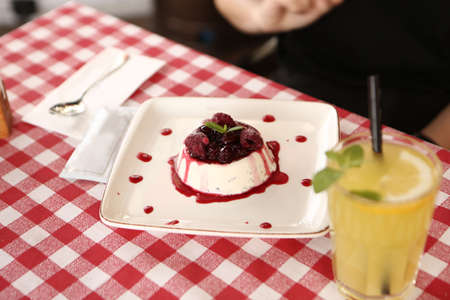 Plate with tasty panna cotta on table