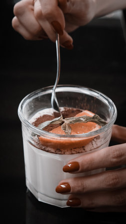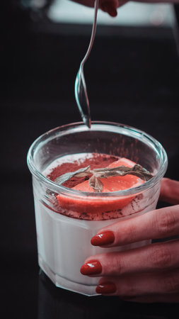 Panna cotta in a glass with fresh strawberries on top, captured in a minimalist style with hard lighting and deep shadows for an artistic touch.