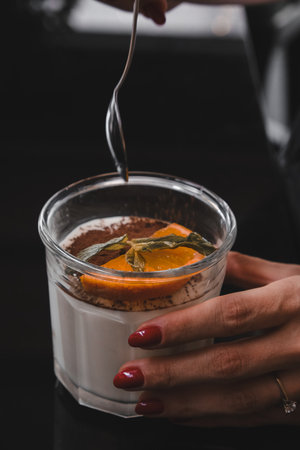 Dessert of cream, berries and red oranges in a glass copy space, light background