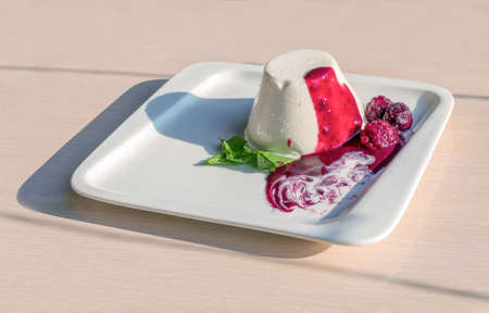 Italian dairy dessert panna cotta with raspberry jam and fresh raspberries on concrete tray