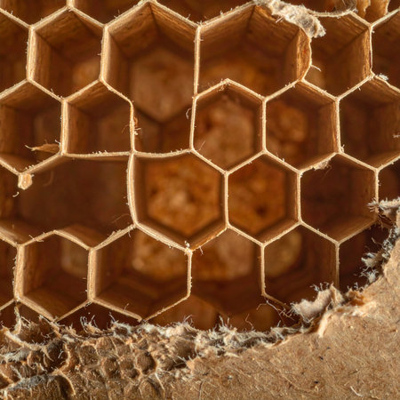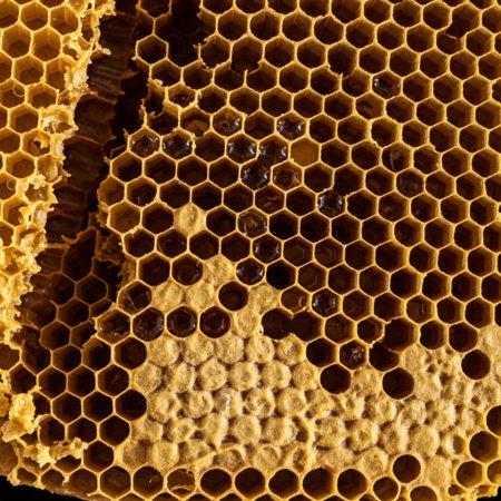 A close-up of a honeycomb structure showing the intricate patterns. Bees use these cells to store honey and pollen. AI generation