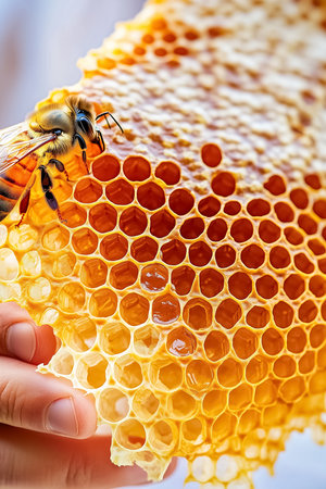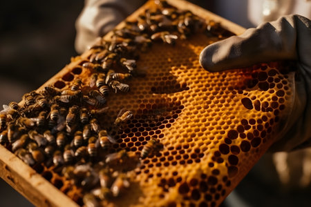 A dedicated beekeeper delicately holds a vibrant honeycomb, where shimmering honey glistens among the intricate hexagonal patterns, bringing the beauty of nature's work to life.