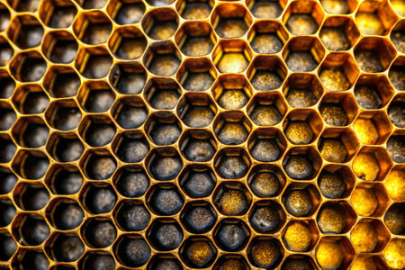 An intricate close-up of a honeycomb structure showcasing golden textures. The play of light and shadow enhances the geometric design, creating an organic yet abstract visual.