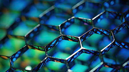 Abstract iridescent hexagonal pattern with light reflections.