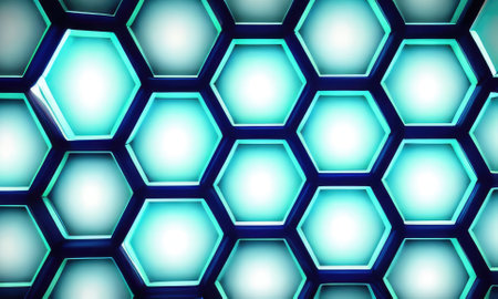 Glowing hexagonal grids in metallic and holographic tones create a mesmerizing display