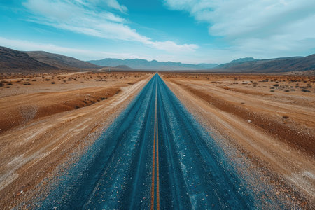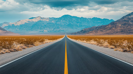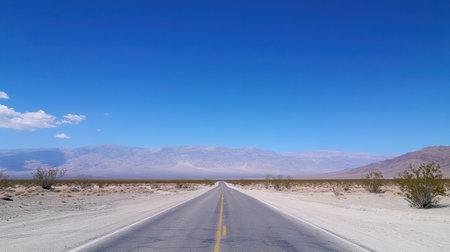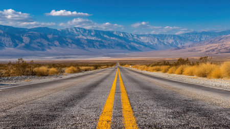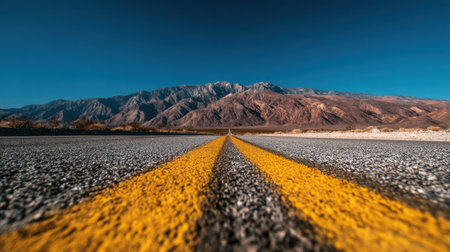 A captivating view of an empty desert road lined with yellow stripes leading towards majestic mountains under a bright blue sky. Ideal for travel themes.