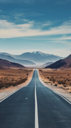 Long, straight highway extends into the desert with majestic mountains in the background during a sunny day, evoking a sense of adventure and freedom.