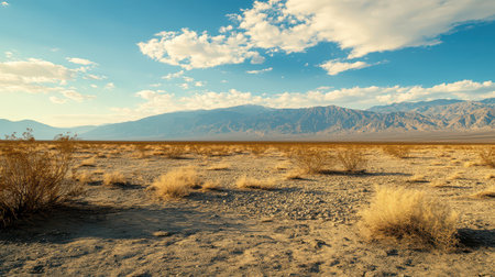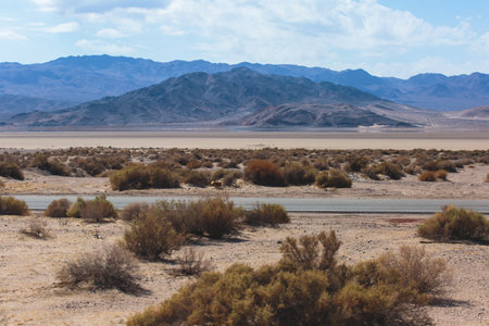 View of Mojave Desert national reserve landscape, an arid rain-shadow desert, California, United States of America, summer sunny day with road, mountains, sand dunes and a blue sky