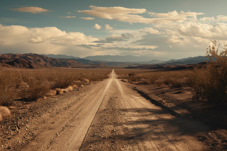 A scenic view of a long road stretching through a dry desert landscape, framed by rugged mountains under a clear, blue sky. The image captures the essence of adventure and exploration, evoking feelings of freedom and tranquility amid the vast beauty of nature.