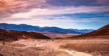 Death Valley, California, USA - December 17, 2018: Panorama of Badlands salt flats and the Panamint Range in the background located in Death Valley National Park.