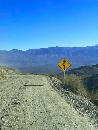 Empty country road with a sign winding road through a desert valley in the Andes, Jujuy province, Argentina