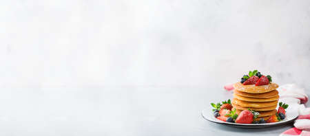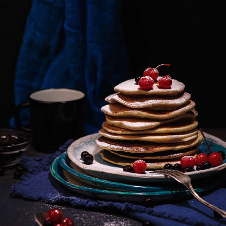 Food and drink, still life, healthy nutrition concept. Stack of homemade pancakes for breakfast with berries and sugar. Light copy space kitchen background