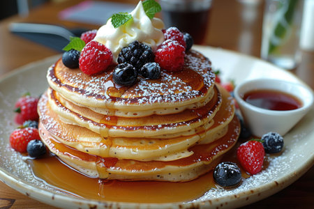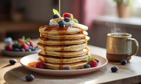 Fluffy golden pancakes stacked high, generously drizzled with maple syrup, topped with fresh blueberries, raspberries, whipped cream, and mint. a steaming cup of coffee sits nearby, creating a cozy breakfast scene.