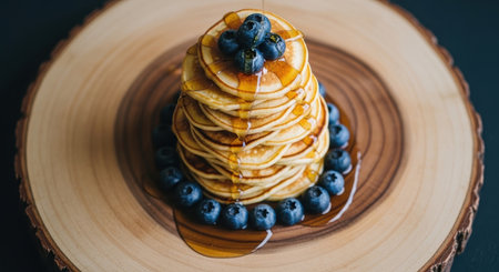Golden brown pancakes stacked high, generously topped with fresh blueberries and sweet maple syrup, presented on a natural wooden slice. perfect breakfast or brunch.
