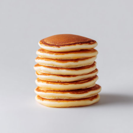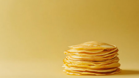 Golden crepes are neatly stacked, showing their warm, inviting texture, perfect for a delicious breakfast or dessert option.