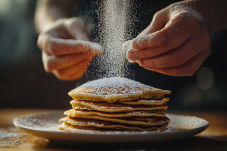 Light dusting of powdered sugar enhances a delightful stack of fluffy pancakes on a wooden table in a cozy kitchen filled with warmth.